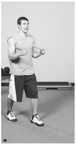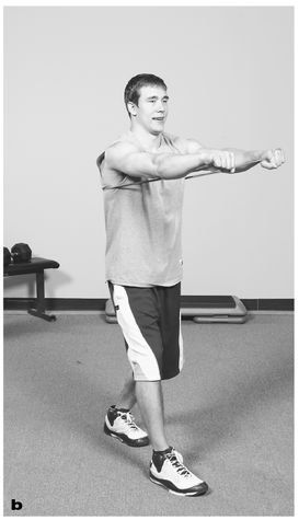 Loop the middle of the band around your shoulder blades and bring the ends under your arms. Grasp both ends of the band at your chest (a). Step forward with one leg while you push the ends of the band forward (b). Slowly return to the starting position.