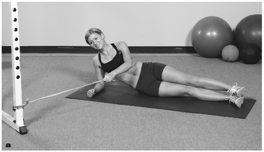 Secure one end of the band to a sturdy object near the floor. Lie on your side with your elbow directly under your shoulder. Use your other hand to grasp the band (a) and perform a single-arm rowing exercise (b) while lifting your hips off the floor and stabilizing the side bridge position. Slowly return.
