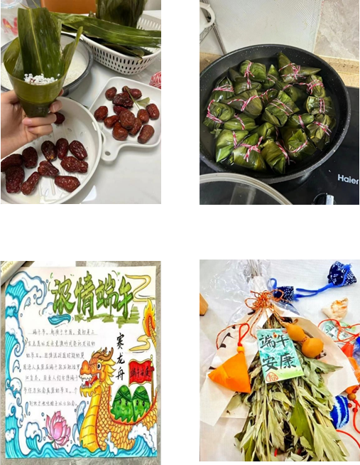 活动中,同学们通过多种形式亲身体验了端午节的传统习俗。和家人一起捋粽叶、做形状、填糯米、扎捆,亲手包制了精美的粽子,品尝粽子感悟美好生活;通过手抄报将端午节的由来、习俗、故事、诗词歌赋等文化内涵呈现在一幅幅作品中,找寻“端午节”的踪迹;制作艾草挂饰,将对家人平安的祝福寄托其中。