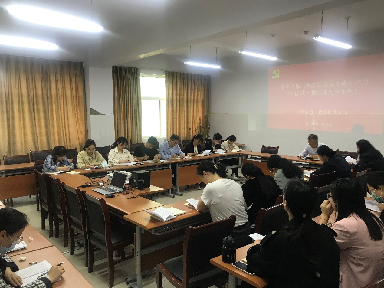为扎实开展党纪学习教育,筑牢拒腐防变的思想道德防线,2024年5月8日下午,电子信息工程公司党总支在拓新1号楼1331会议室开展“以案促改”党纪学习教育,党总支副书记曹玉瑞主持,全体党员参加。