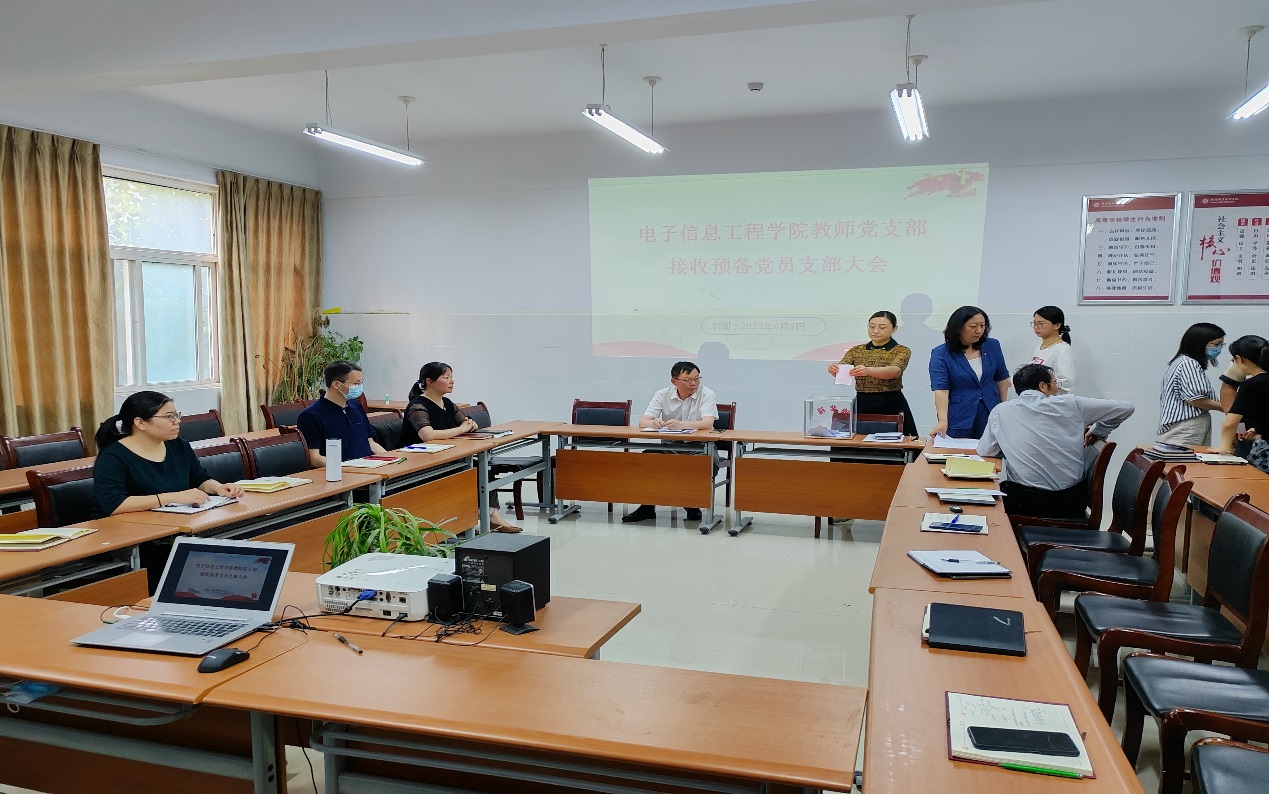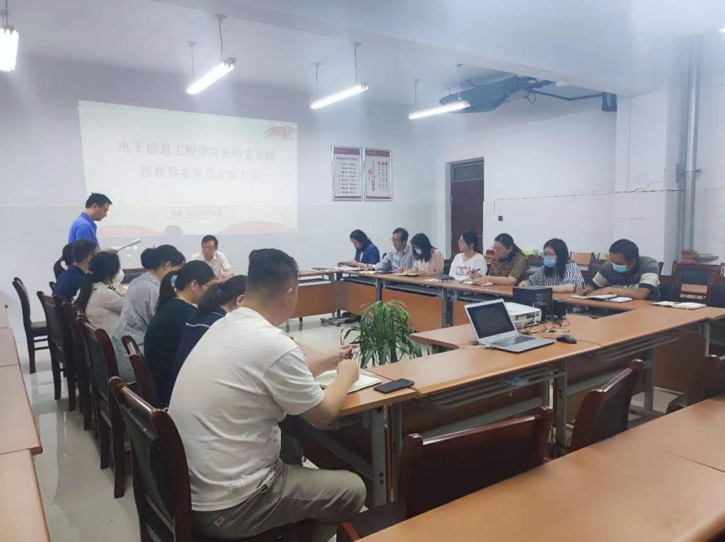 2023年6月8日,电子信息工程学院教师党支部在拓新2号楼1331会议室召开接收预备党员支部大会,会议由党支部书记李素娟主持,全体党员参加。