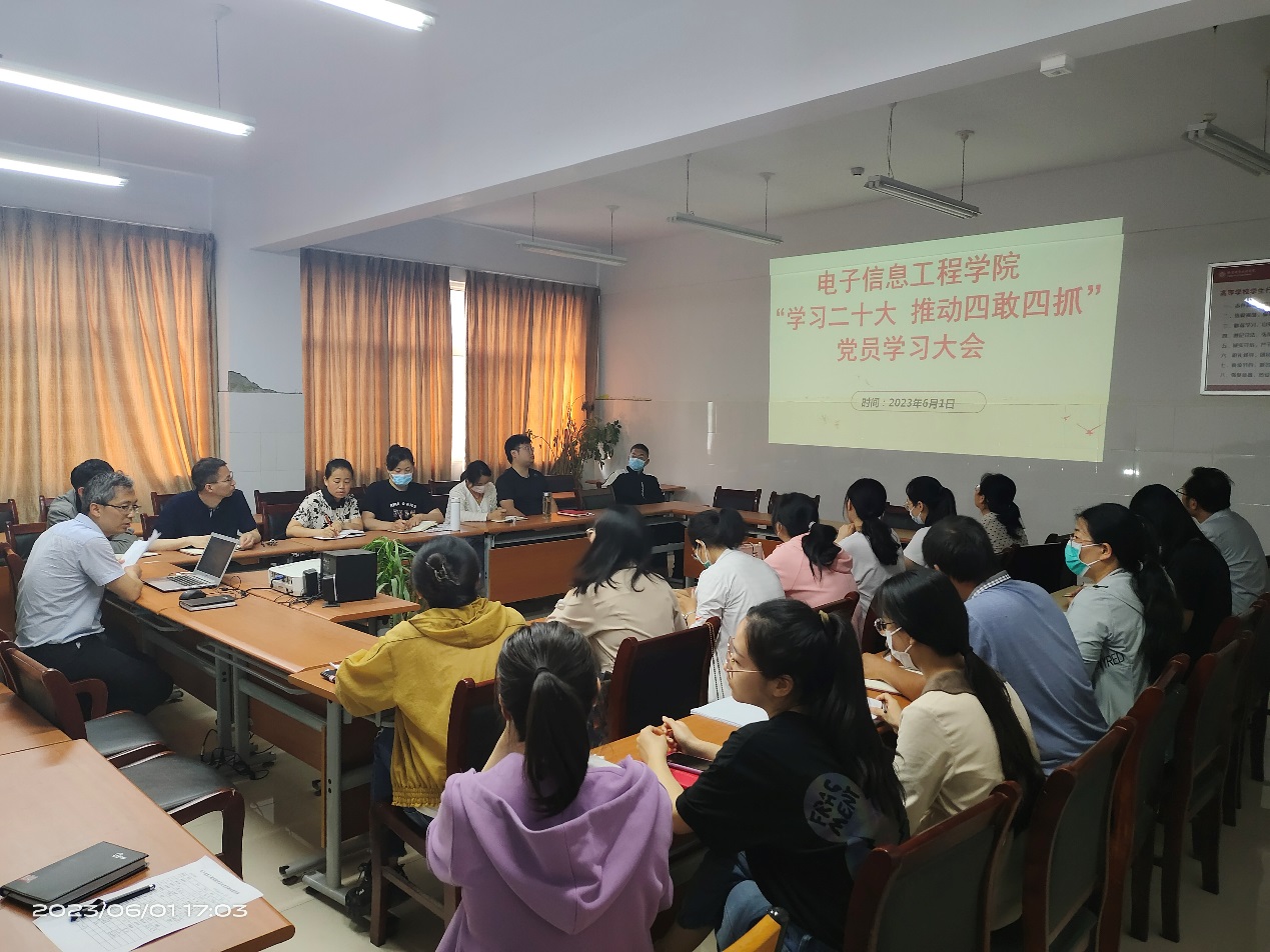 6月1日下午,电子信息工程学院在拓新2号楼1331会议室召开以“数字变革与教学改革”为主题的“学习二十大 推动四敢四抓”党员学习大会。党总支副书记曹玉瑞主持,全体党员参加。