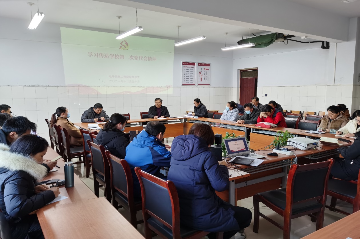 12月30日下午,电子信息工程公司党总支在拓新2号楼1331会议室召开学习学校第二次党代会精神专题会议,全体教师参加,党总支副书记曹玉瑞主持。