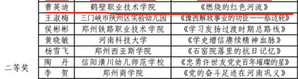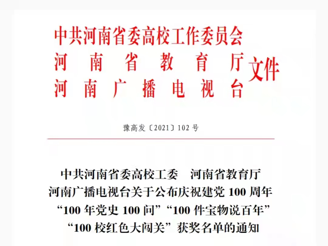 近日,中共河南省委高校工委、河南省教育厅、河南广播电视台联合下发通知,公布了庆祝建党 100周年部分活动的获奖名单,公司曹英迪老师制作的微党课作品《燃烧的红色河流》荣获“100年党史100问”活动二等奖。