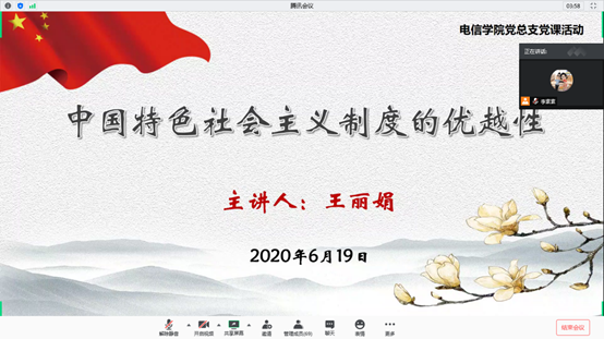 2020年6月19日下午,电子信息工程公司党总支通过腾讯会议召开全体党员大会,邀请马克思主义学院的王丽娟老师讲授专题党课——《中国特色社会主义制度的优越性》,党总支79名党员、预备党员和积极分子参加了本次党课。