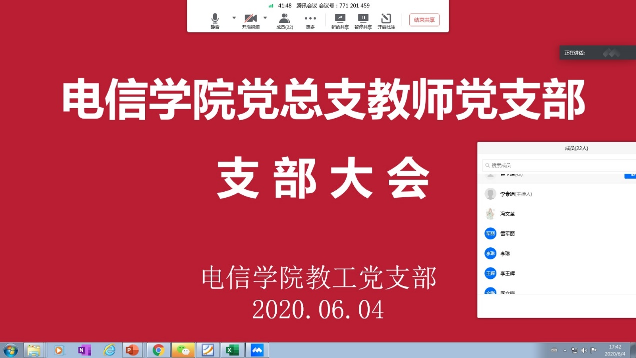2020年6月4日,电信学院教师党支部召开党员大会,研究讨论发展对象李文强转为中共预备党员的申请。大会由党支部书记曹玉瑞主持,全体党员参加。