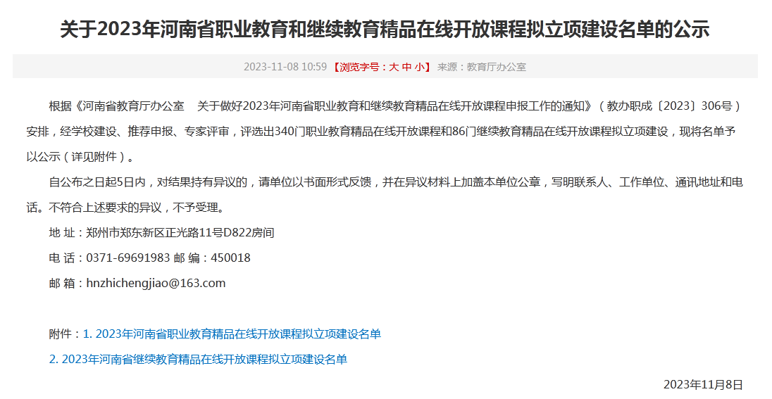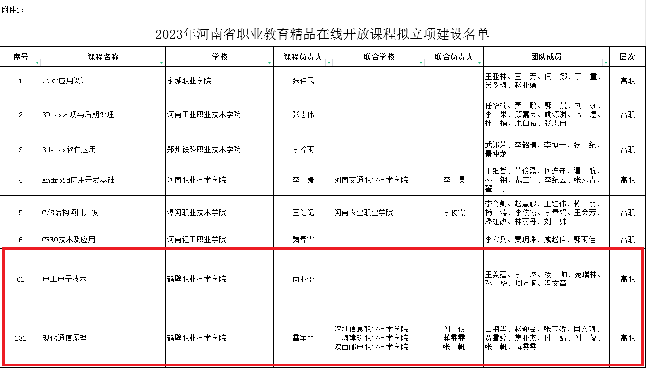 近日,河南省教育厅公布了2023年河南省职业教育精品在线开放课程拟立项建设名单,公司电子技术教研室尚亚蕾老师主持的《电工电子技术》和通信技术教研室雷军丽老师主持的《现代通信原理》2门职业教育精品在线开放课程获批立项建设。