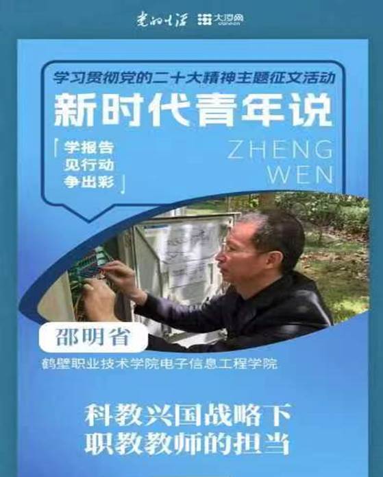 近日,电子信息工程学院邵明省老师积极参与了《党的生活》杂志与大河网举办的新时代青年说征文活动,《科教兴国战略下职教教师的担当》一文被大河网刊发。文章以党的二十大报告强调的科教兴国为主线,从打铁还需自身硬、育人育德育心等方面强调了科技、教育与人才的重要性,将党的二十大精神作为思政元素融入课程,加强员工思想道德教育,用责任感、使命感厚植员工的拼搏精神,用专业励志案例鼓励员工,提升动手能力,为人才储备提供支撑。
