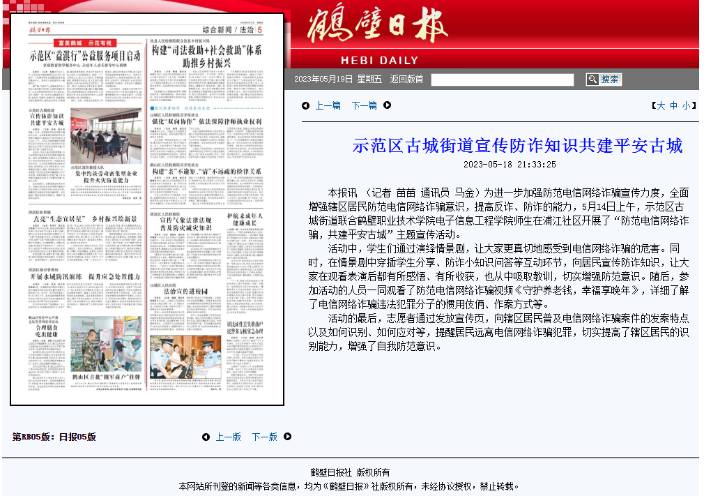 近日,电子信息工程学院师生联合浦江社区党支部开展的“5.17电信日”反电信诈骗主题党日活动,被鹤壁电视台、《鹤壁日报》等媒体宣传报道,5月22日通过鹤壁学习平台推送至学习强国。